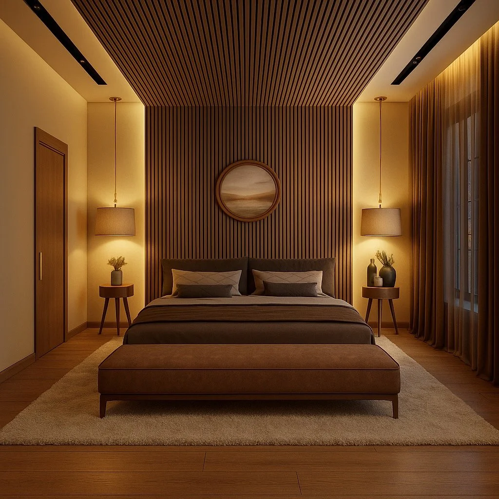 In this dramatic design, the accent wall continues seamlessly onto the ceiling. The central section becomes the centerpiece of the room and often includes integrated lighting or slat panels for a bold architectural effect.