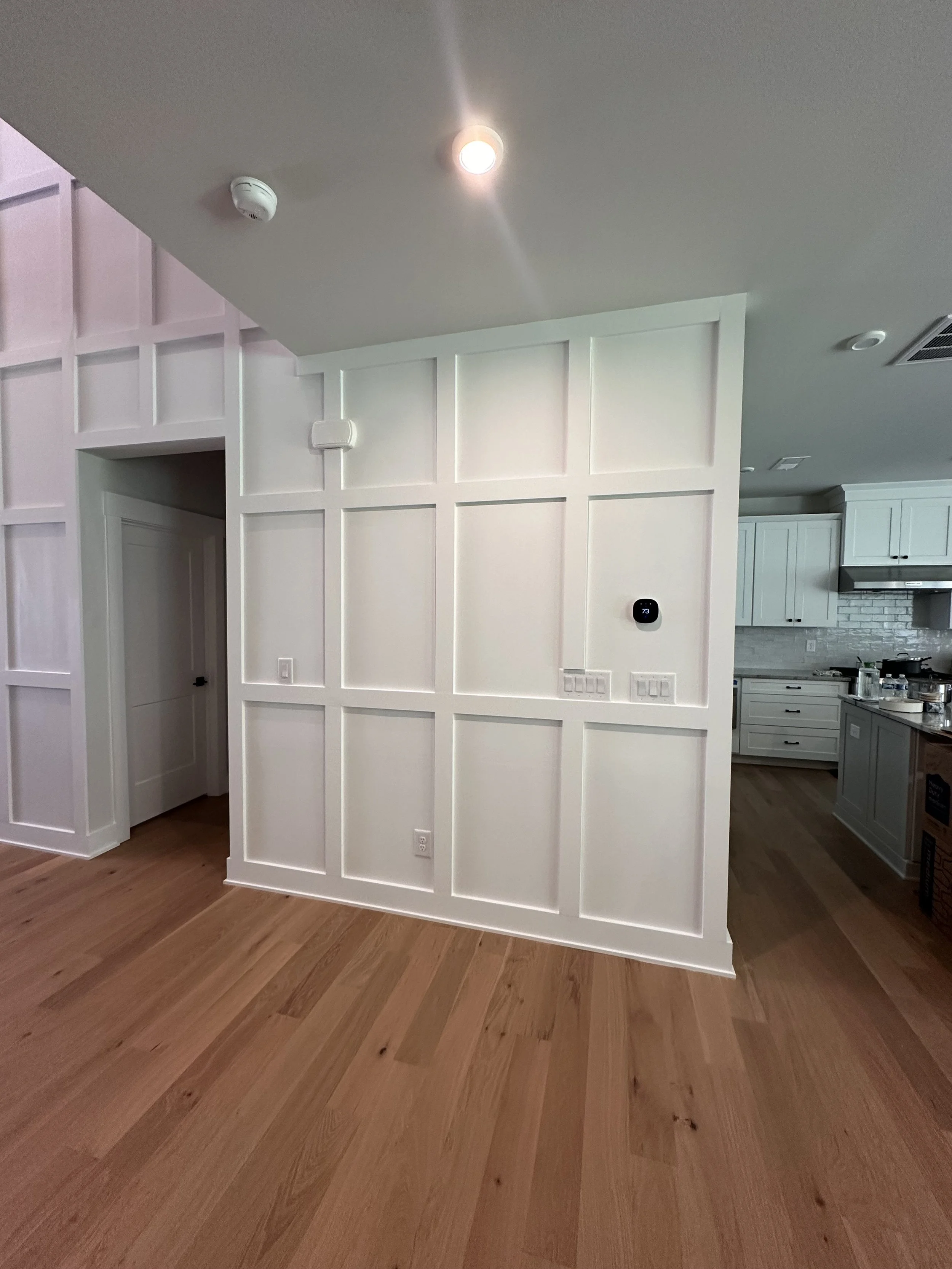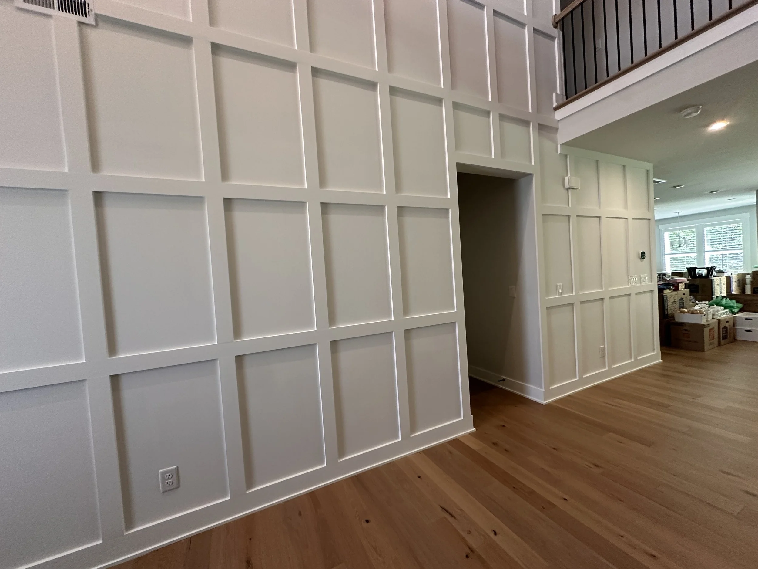 In a beautiful residential home located in Charlotte, North Carolina, we recently completed a standout custom wall transformation that added both architectural elegance and warmth to the interior. The client wanted a fresh, clean look that would immediately draw attention upon entering the home—and we delivered just that with a full-height board and batten accent wall that spans both the living room and entry corridor.