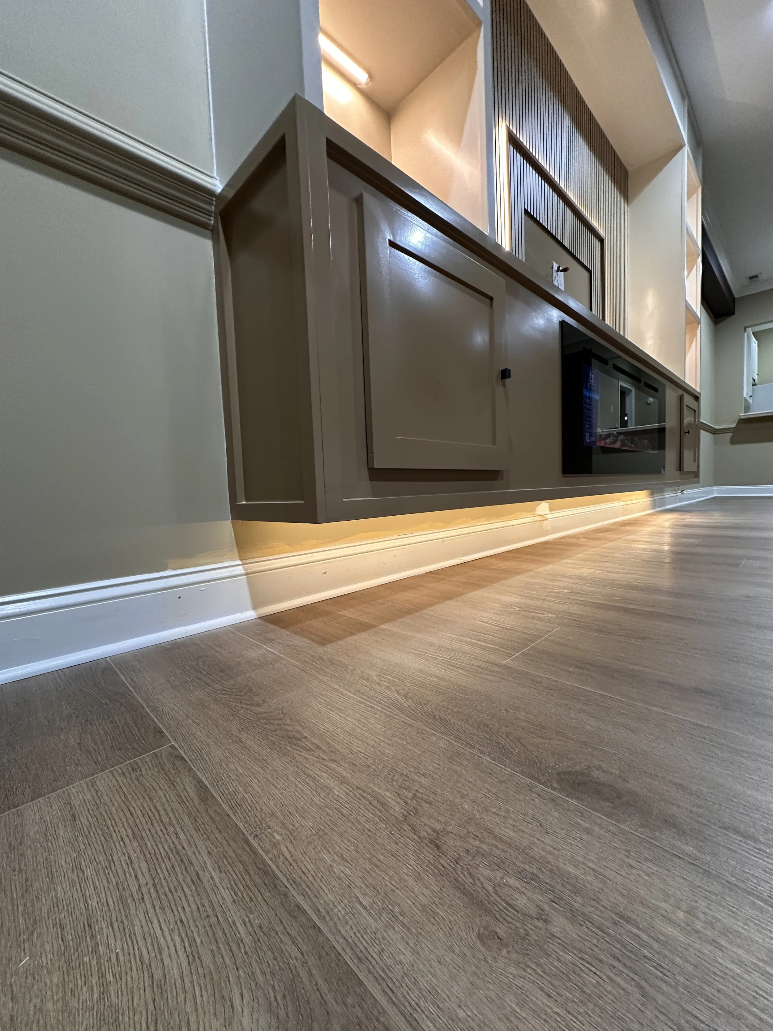 Think wood slat accent panels, floating shelves, quartz surfaces, and dramatic backlighting—similar to the sleek design shown in the image above.